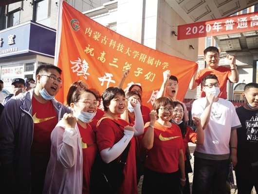 為學(xué)生送考是包四中的傳統(tǒng)。當(dāng)日7時許,身著“包四必勝”紅色T恤的高三年級組長楊文亮早早來到考場為學(xué)生送考。這名任教20年的教師已經(jīng)歷過6次高考,每一次他都要親自將學(xué)生送上考場。與他同來的十幾名包四中教師或與學(xué)生擊掌,或向他們打著必勝的手勢,激勵大家沉著應(yīng)考,考出水平。楊文亮說:“在每場考試結(jié)束前,老師們都會提前來到現(xiàn)場,等著同學(xué)們出來,給他們打氣,幫助他們調(diào)整情緒。有時學(xué)生會說考試題目比較難,這時老師們就會告訴學(xué)生不要過分焦慮,正常發(fā)揮出自己的實(shí)力就好,題難不是一人難,每名考生都會面對同樣的難題。通過這樣的交流為考生進(jìn)行心理疏導(dǎo),消除考生緊張焦慮的情緒,繼續(xù)為接下來的考試做好準(zhǔn)備?!保ú邉澸w永峰 記者李碩 霍曉霞 萬菲 實(shí)習(xí)生許昕元 通訊員李瞳)