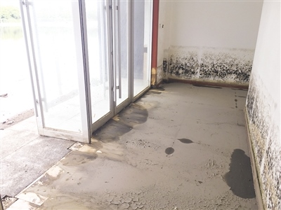 積水路面東側(cè)是已經(jīng)處于廢棄狀態(tài)的白廟子公安檢查站,檢查站內(nèi)外均殘留著被水泡過的痕跡。7月8日深夜,呼和浩特又降大雨。9日,記者再次來到緯五路看到,路面上的積水已經(jīng)蔓延到了檢查站樓內(nèi)。樓內(nèi)一片狼藉,從墻面上殘留的水印看,遭水淹最嚴重時樓內(nèi)積水深達五六十公分。