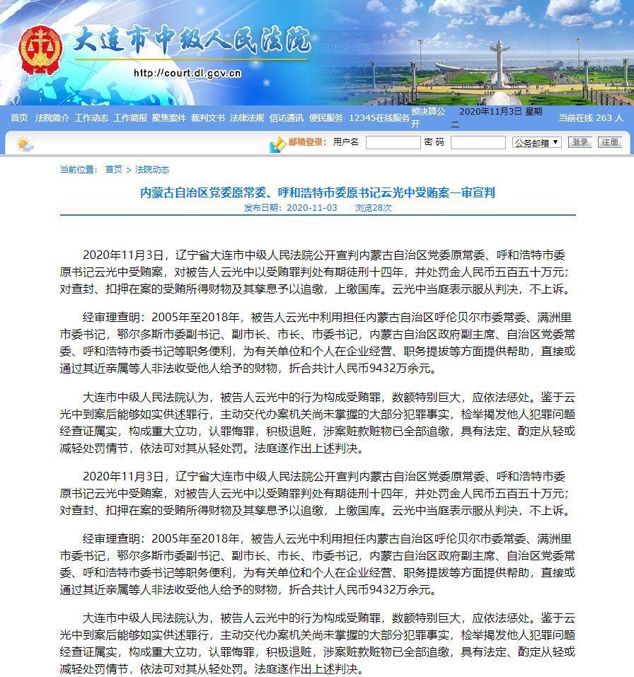 2020年11月3日,遼寧省大連市中級(jí)人民法院公開(kāi)宣判內(nèi)蒙古自治區(qū)黨委原常委、呼和浩特市委原書記云光中受賄案,對(duì)被告人云光中以受賄罪判處有期徒刑十四年,并處罰金人民幣五百五十萬(wàn)元;對(duì)查封、扣押在案的受賄所得財(cái)物及其孳息予以追繳,上繳國(guó)庫(kù)。云光中當(dāng)庭表示服從判決,不上訴。