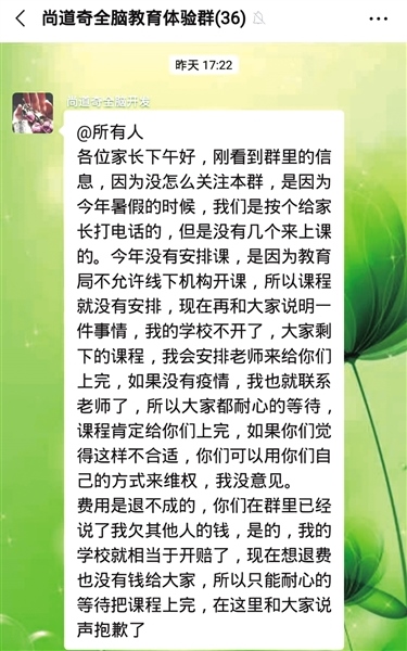 根據(jù)謝女士提供的轉(zhuǎn)賬證明和聊天截圖記者注意到,“尚道奇全腦教育體驗(yàn)群”1月15日發(fā)布的一則通知稱(chēng),今年暑假,機(jī)構(gòu)老師曾挨個(gè)給家長(zhǎng)打電話通知上課,但是沒(méi)有幾個(gè)來(lái)上課的,加上教育局不允許線下機(jī)構(gòu)開(kāi)課,所以課程遲遲沒(méi)有安排。并稱(chēng)學(xué)校賠錢(qián)了,沒(méi)有錢(qián)退給大家,只能耐心等待疫情結(jié)束后安排上課,如果家長(zhǎng)覺(jué)得不合適,可以用自己的方式維權(quán)?!八恼f(shuō)辭明顯前后矛盾,暑假期間說(shuō)課件損毀,現(xiàn)在又說(shuō)沒(méi)學(xué)生上課?!敝x女士氣憤地說(shuō),和她遭遇同樣情況的還有30多名家長(zhǎng),399元雖然不是大數(shù)目,但這樣欺騙大家實(shí)屬不該。