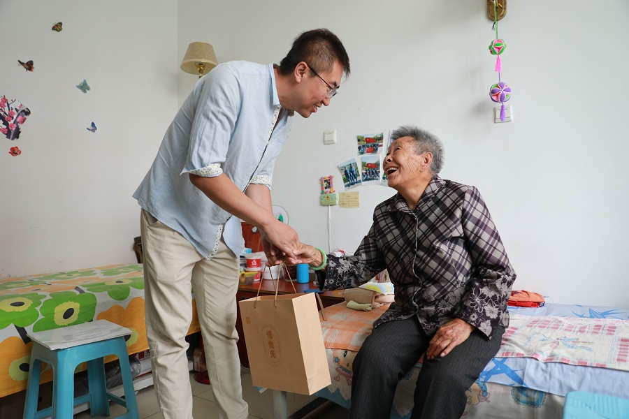 中午時分,捐贈代表來到位于呼市金山開發(fā)區(qū)的??道夏旯ⅰT诟?道夏旯⒗钣懒猎洪L的帶領(lǐng)下,安德爾等走進公寓樓,將愛心月餅送到老人的手里。