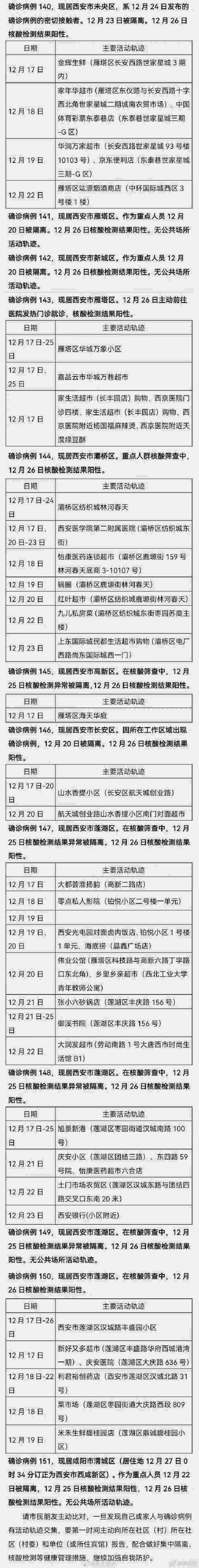 根據(jù)疾控等部門流調(diào)情況,12月26日0-24時(shí)西安市新增的150例確診病例的公共場所活動(dòng)軌跡公布如下: