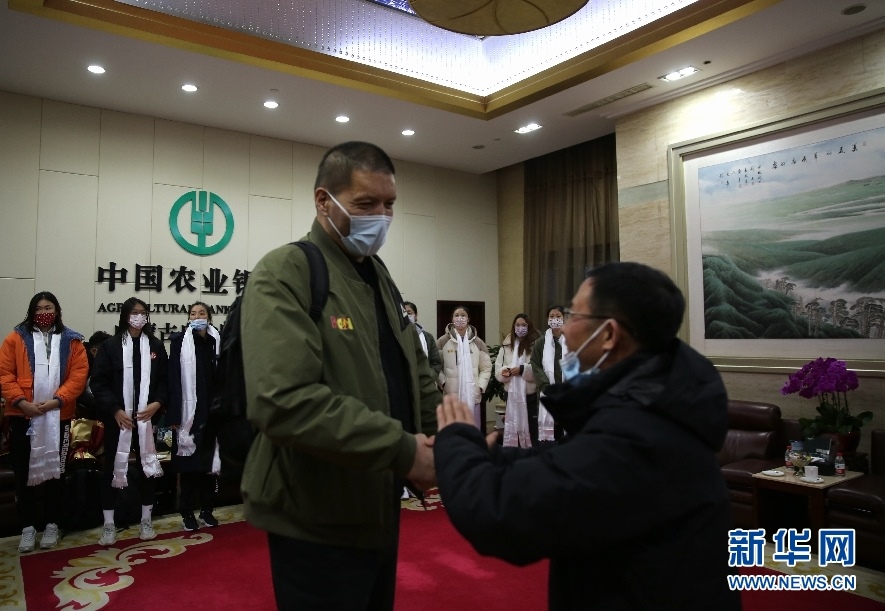 內(nèi)蒙古籃球協(xié)會主席巴特爾與前來迎接球隊的球迷握手。新華網(wǎng)楊騰格爾攝