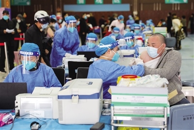 在接種臺前,醫(yī)護人員分工明確,核驗接種人群身份信息、詢問病史和疫苗接種情況,每個環(huán)節(jié)有條不紊地進行著。