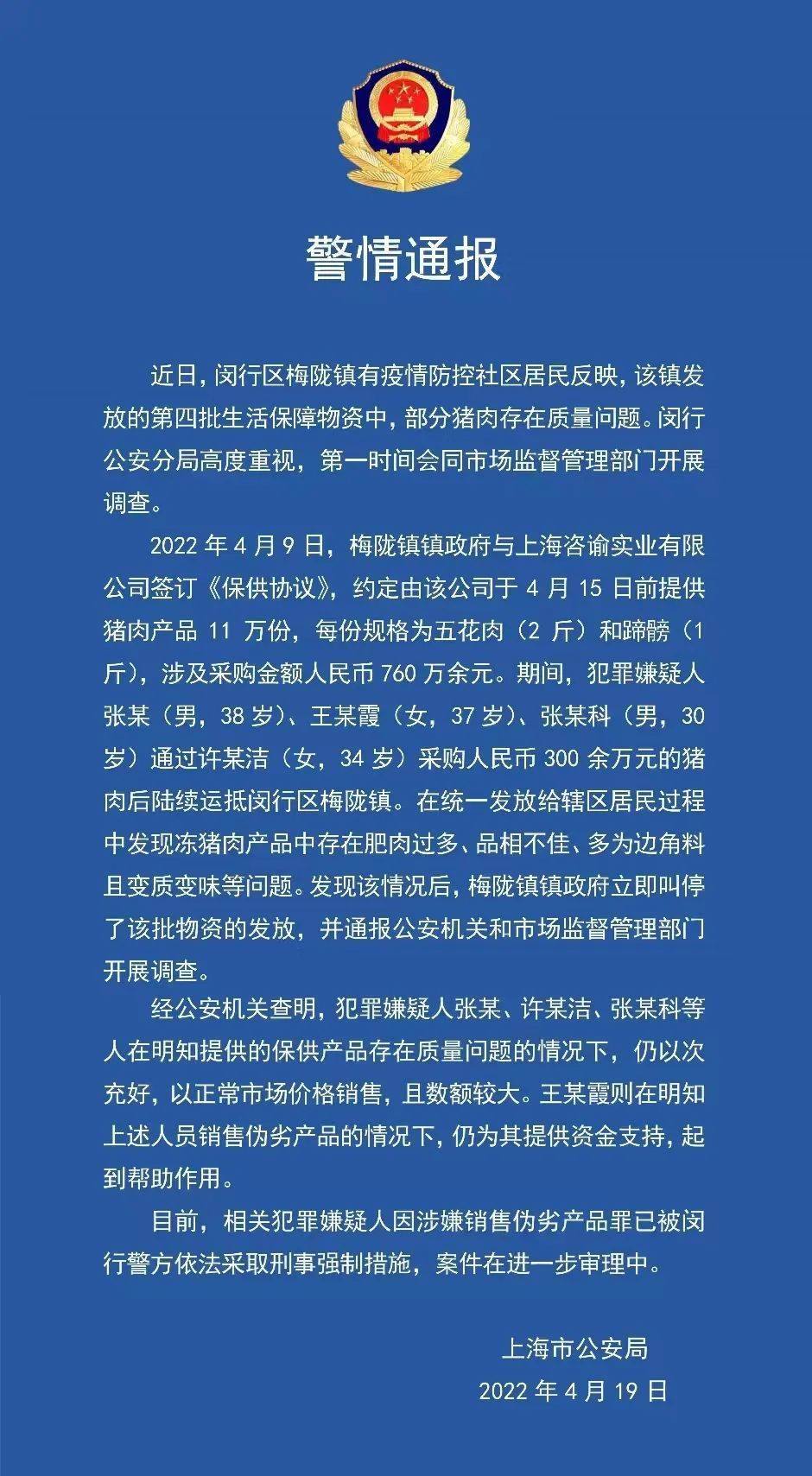 警方通報(bào):2022年4月9日,梅隴鎮(zhèn)鎮(zhèn)政府與上海咨諭實(shí)業(yè)有限公司簽訂《保供協(xié)議》,約定由該公司于4月15日前提供豬肉產(chǎn)品11萬(wàn)份,每份規(guī)格為五花肉(2斤)和蹄髈(1斤),涉及采購(gòu)金額人民幣760萬(wàn)余元。其間,犯罪嫌疑人張某(男,38歲)、王某霞(女,37歲)、張某科(男,30歲)通過(guò)許某潔(女,34歲)采購(gòu)人民幣300余萬(wàn)元的豬肉后陸續(xù)運(yùn)抵閔行區(qū)梅隴鎮(zhèn)。在統(tǒng)一發(fā)放給轄區(qū)居民過(guò)程中發(fā)現(xiàn)凍豬肉產(chǎn)品中存在肥肉過(guò)多、品相不佳、多為邊角料且變質(zhì)變味等問(wèn)題。發(fā)現(xiàn)該情況后,梅隴鎮(zhèn)鎮(zhèn)政府立即叫停了該批物資的發(fā)放,并通報(bào)公安機(jī)關(guān)和市場(chǎng)監(jiān)督管理部門開展調(diào)查。