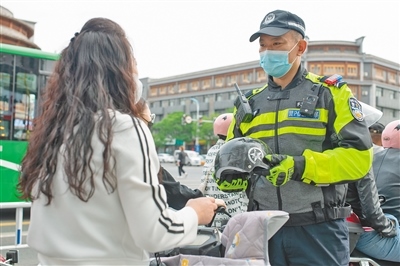 袁超勸導(dǎo)騎行電動(dòng)車的市民佩戴頭盔