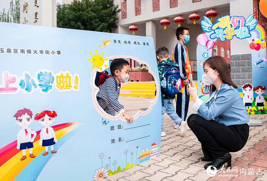 呼和浩特市玉泉區(qū)南柴火市街小學(xué)的師生們?cè)跉g迎一年級(jí)新生入校。丁根厚攝