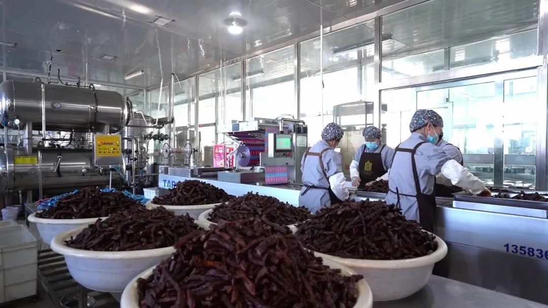 白音杭蓋非遺就業(yè)工坊員工在挑選非遺產(chǎn)品炭烤牛肉干
