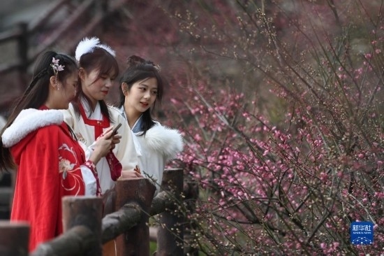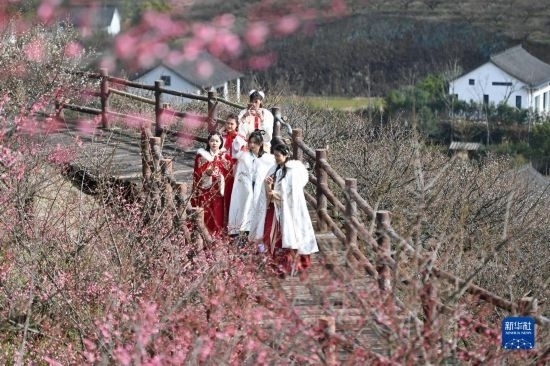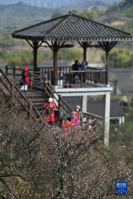 當(dāng)日,西塞山第五屆梅花節(jié)在浙江省湖州市吳興西塞山旅游度假區(qū)原鄉(xiāng)小鎮(zhèn)景區(qū)開幕,盛開的梅花吸引不少游客前來觀賞。