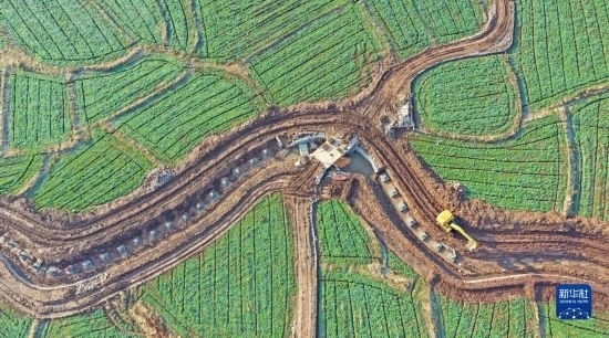 2月16日,在湖南省永州市道縣壽雁鎮(zhèn)芽洞村,工人駕駛挖掘機在高標準農(nóng)田建設項目現(xiàn)場施工(無人機照片)。