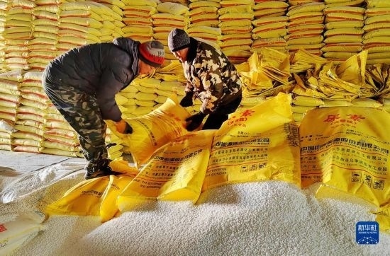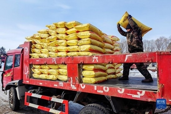 2月16日,北大荒集團五大連池農(nóng)場科技服務中心工人在裝運肥料。