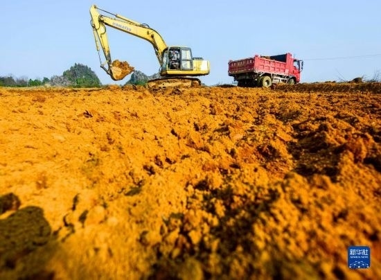 2月16日,在湖南省永州市道縣壽雁鎮(zhèn)芽洞村,工人駕駛挖掘機在高標準農(nóng)田建設項目現(xiàn)場施工。
