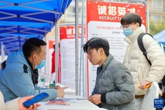 2月17日,在中國成都人力資源服務(wù)產(chǎn)業(yè)園,求職者(中)與招聘企業(yè)工作人員交流。