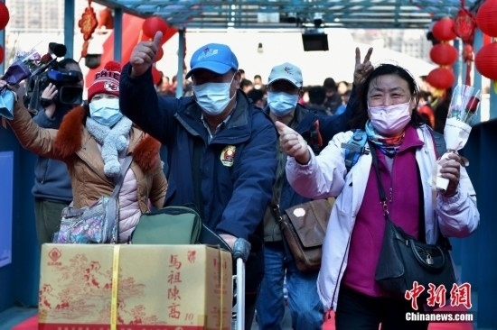 2月19日,搭載59名旅客的“吉順9號”客輪緩緩駛?cè)敫V葸B江黃岐客運碼頭,標志著連江黃岐至馬祖白沙“小三通”客運航線復(fù)航。此前,廈門-金門客運航線、福州馬尾-馬祖客運航線、泉州-金門客運航線已相繼復(fù)航。圖為兩岸鄉(xiāng)親在黃岐客運碼頭激動相擁。中新社記者 張斌 攝
