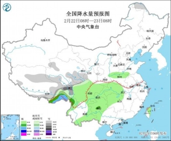 全國降水量預報圖(2月22日08時-23日08時)。圖片來源:中央氣象臺網(wǎng)站