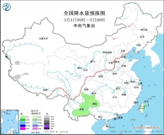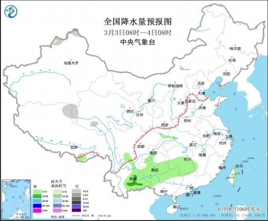 全國降水量預報圖(3月3日08時-4日08時)圖片來源:中央氣象臺網(wǎng)站