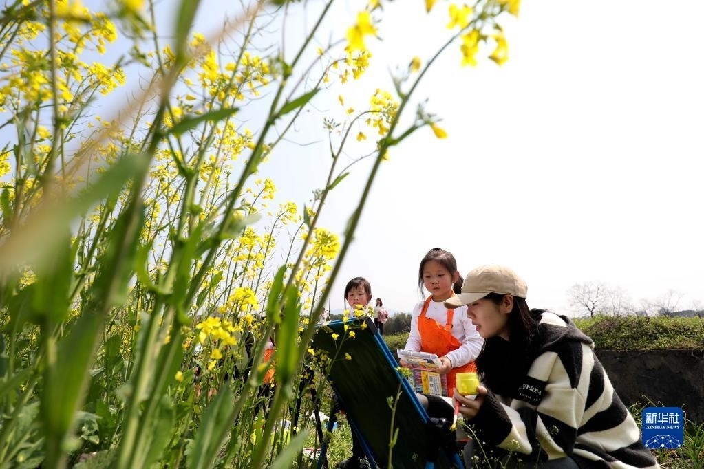2月28日,在湖南省資興市唐洞街道高碼村,小朋友在油菜花田旁畫畫。
