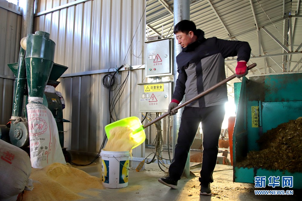 牧民羅布倉在自家牛棚草料庫攪拌牛飼料。新華網(wǎng)發(fā)(韓飛 攝)