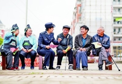 3月14日,在西平縣老王坡高標(biāo)準(zhǔn)服務(wù)中心的二樓平臺,臺曉林(右)、王英凡和王仲琦(左)下班后在看夕陽。