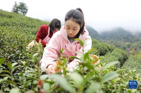 3月21日,茶農(nóng)在貴州省綏陽縣小關(guān)鄉(xiāng)大寨村的茶園種植基地里采茶。