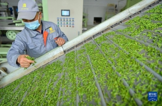 3月22日,在湖北省宣恩縣椒園鎮(zhèn)一茶葉加工廠,工人在檢查傳送帶上的茶葉。