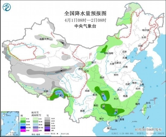 中新網(wǎng)3月30日電 據(jù)中央氣象臺(tái)網(wǎng)站消息,未來(lái)三天,西南地區(qū)東部、江南、華南等地多降水天氣,其中,江南南部、華南等地的部分地區(qū)有中到大雨,局部暴雨。4月1-5日,強(qiáng)冷空氣影響我國(guó)中東部地區(qū),北方大部地區(qū)氣溫下降6~10℃,局地12℃以上,南方地區(qū)氣溫下降4~8℃。