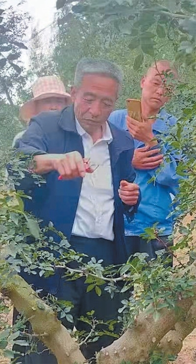 甘肅省秦安縣農業(yè)技術推廣研究員靳志強(中)向農民傳授剪枝技術。潘虎林攝
