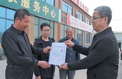 山東省平原縣鄉(xiāng)村振興服務中心工作人員為農民農藝師王篤春(左一)頒發(fā)證書。辛 凱攝