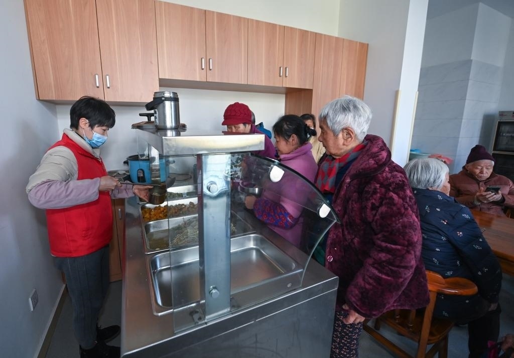 2023年2月21日,老人們在杭州市臨安區(qū)錦南街道居家養(yǎng)老服務中心的食堂用餐。新華社記者徐昱攝