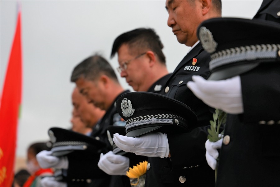 上午10時(shí),60名干部民警整齊列隊(duì),警容嚴(yán)整,脫帽肅立,向?yàn)槿嗣窆彩聵I(yè)英勇獻(xiàn)身的英烈默哀,緬懷他們的豐功偉績(jī),寄托對(duì)革命先烈的無(wú)限哀思。伴著肅穆的《獻(xiàn)花曲》,民警們依次瞻仰紀(jì)念碑并敬獻(xiàn)鮮花。隨后,全體民警面向黨旗和烈士紀(jì)念碑,高舉右拳,以錚錚誓言筑牢理想信念,以拳拳初心踐行為民宗旨。(王鵬)