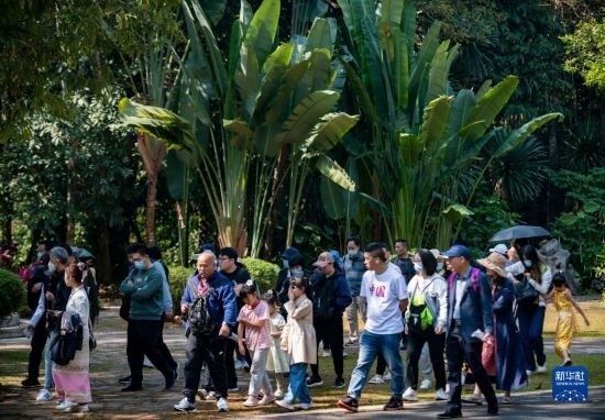 游客在位于云南省西雙版納州勐臘縣勐侖鎮(zhèn)的中國科學(xué)院西雙版納熱帶植物園內(nèi)游覽(2023年2月12日攝)。