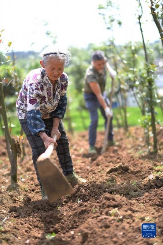 4月15日,村民在貴州省開陽縣南龍鄉(xiāng)中橋村中藥材種植基地套種黃豆。