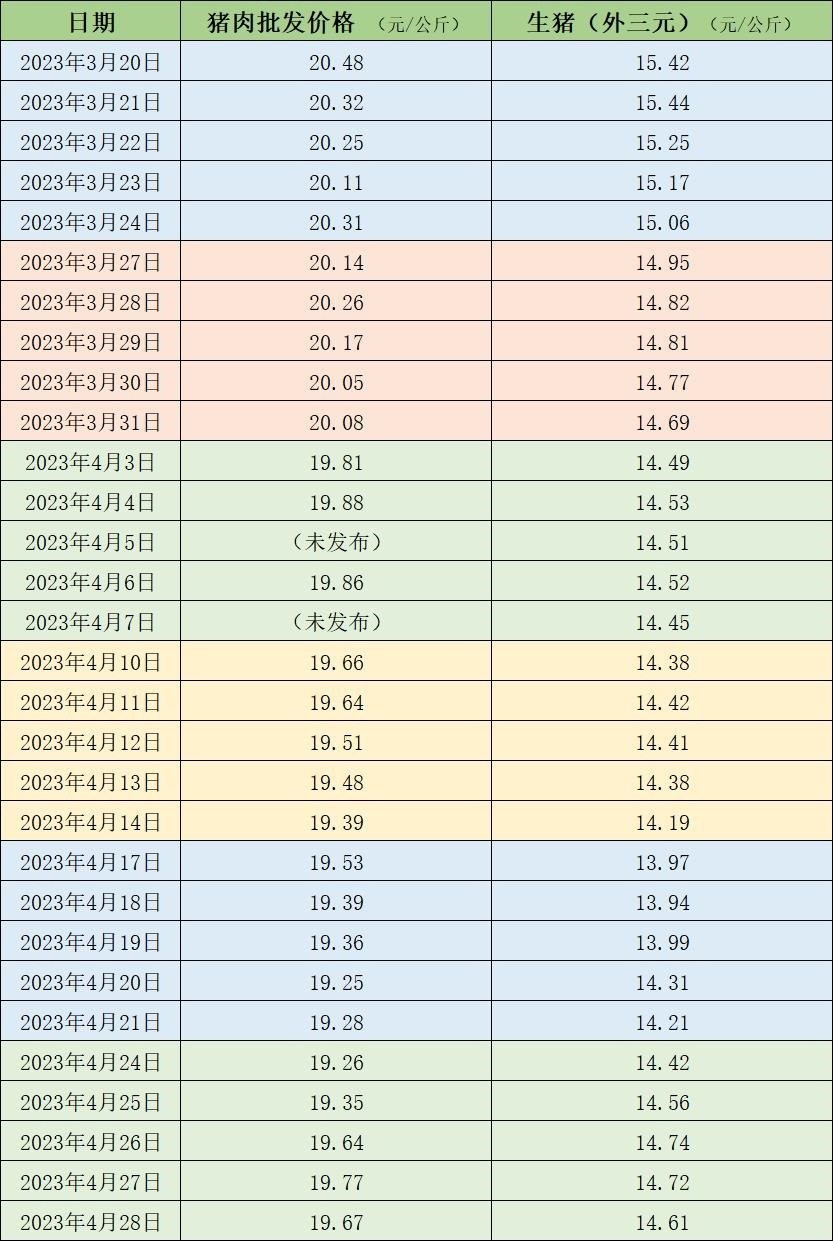 據(jù)農(nóng)業(yè)農(nóng)村部監(jiān)測(cè),4月28日,全國(guó)農(nóng)產(chǎn)品批發(fā)市場(chǎng)豬肉平均價(jià)格為19.67元/公斤,與上周五(4月21日)的19.28元/公斤相比,上漲2%。本周的平均價(jià)格為19.54元/公斤,與上周19.36元/公斤相比,上漲0.9%。