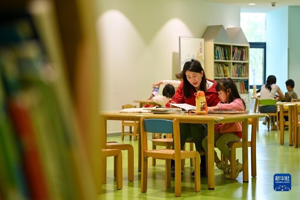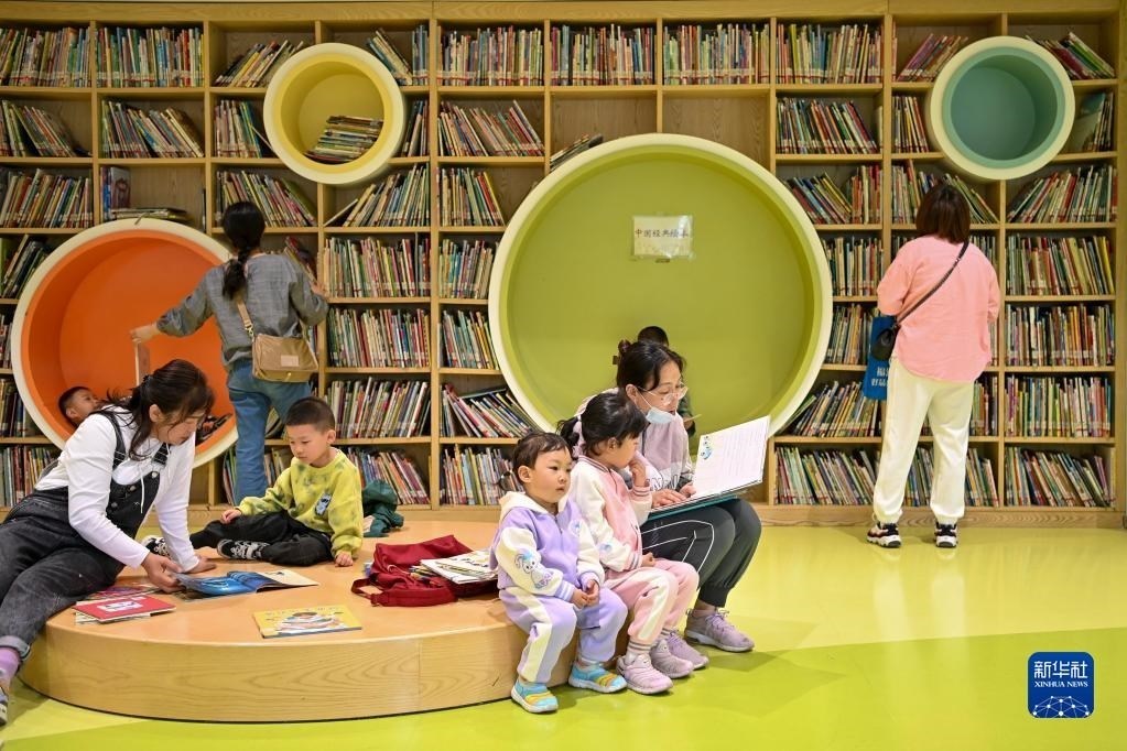 5月2日,一名家長(zhǎng)帶著小朋友在江蘇省泰興市新時(shí)代文明實(shí)踐中心城市書房閱讀。