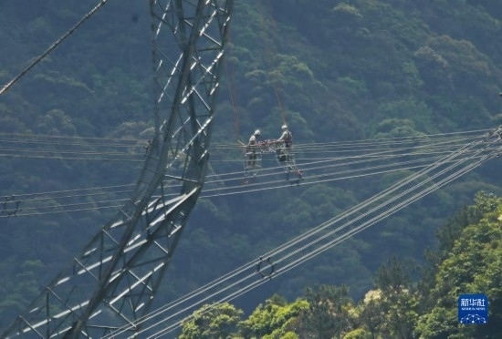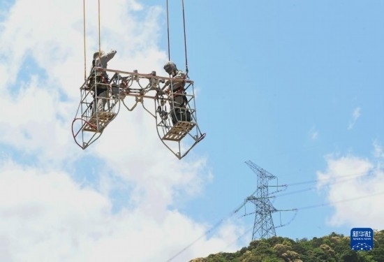 5月4日,在福建省寧德市洪口鄉(xiāng),國(guó)網(wǎng)福建超高壓公司帶電班檢修工周曉剛(右)對(duì)輸電線路進(jìn)行帶電作業(yè)。