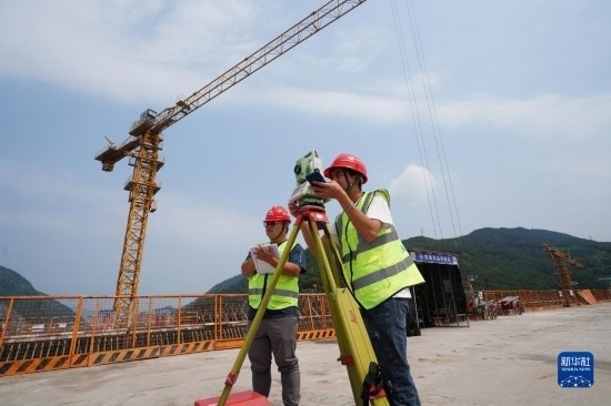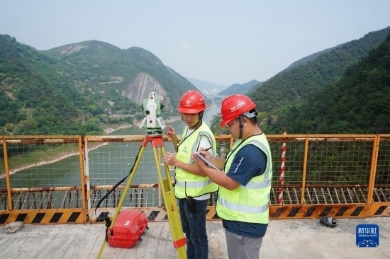5月4日,在重慶市北碚區(qū)渝武高速?gòu)?fù)線觀音峽嘉陵江特大橋,中交一公局四公司橋梁工區(qū)工作人員孫培耕(右)和彭昭屏在對(duì)橋面高程及軸線偏位進(jìn)行測(cè)量。