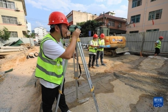 5月4日,青年工人在貴州省銅仁市江口縣雙江街道雙月社區(qū)城市供排水提升工程施工現(xiàn)場(chǎng)工作。