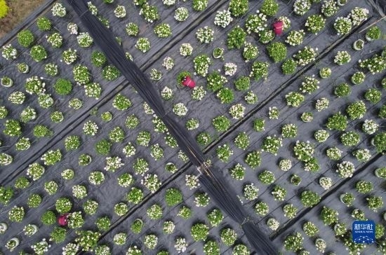 5月5日,在肥西縣經(jīng)開(kāi)區(qū)一家農(nóng)林科技企業(yè),員工在打理繡球花(無(wú)人機(jī)照片)。