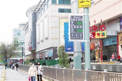 5月7日上午,在中山西路,記者看到懸掛的智能停車指引屏上顯示附近停車場(chǎng)的位置,以及停車場(chǎng)的停車位余量。維多利購物中心附近的一個(gè)智能停車指引屏上顯示民族大世界有7個(gè)空余停車位、民族商場(chǎng)有18個(gè)空余停車位,而這些數(shù)據(jù)也在實(shí)時(shí)更新,市民根據(jù)智能停車指引屏的信息便能輕松找到停車位,不用再為停車難而發(fā)愁。