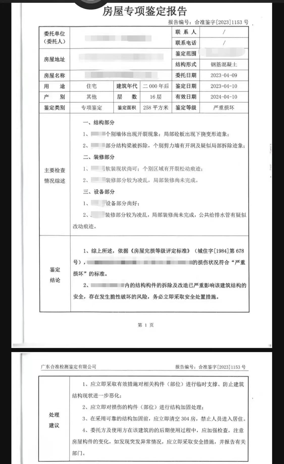 值得注意的是,發(fā)現(xiàn)204房的承重墻被拆后,有業(yè)主曾自費(fèi)請鑒定機(jī)構(gòu)對204房、304房進(jìn)行安全鑒定。鑒定結(jié)果顯示,涉事房屋的損傷程度符合“嚴(yán)重?fù)p壞”的標(biāo)準(zhǔn);在采用可靠的結(jié)構(gòu)加固前,應(yīng)立即清空304房,禁止人員進(jìn)入居住。而在5月5日,永平街道辦在涉事樓棟貼出“致廣大居民朋友的一封信”,其中提到:4月8日至18日,已經(jīng)完成了臨時(shí)加固支撐工程,目前建筑物整體結(jié)構(gòu)穩(wěn)定可控,人員無需轉(zhuǎn)移,但需要盡快加固補(bǔ)強(qiáng)。
