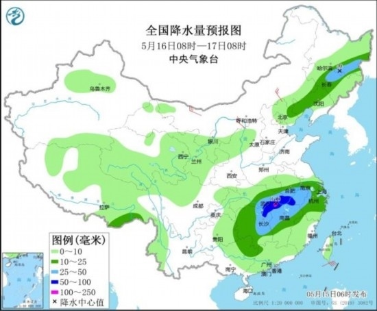 5月16日08時(shí)至17日08時(shí),東北地區(qū)中南部、江淮南部、江漢東部、江南大部、廣西東北部等地部分地區(qū)有中到大雨,其中,安徽西南部、湖北東部、湖南北部、江西北部等地部分地區(qū)有暴雨或大暴雨(100~110毫米)。內(nèi)蒙古中東部等地部分地區(qū)有4~6級(jí)風(fēng)。