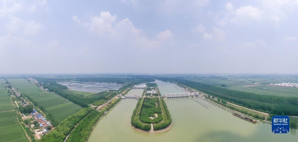這是位于江蘇省泗洪縣的南水北調(diào)東線一期工程泗洪站樞紐(無人機(jī)照片,5月12日攝)。新華社發(fā)(方東旭攝)