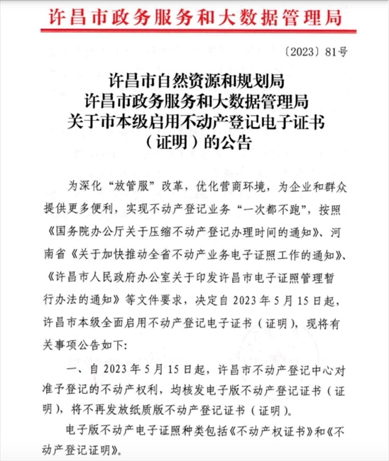 ·河南許昌:全面啟用不動產(chǎn)登記電子證書,不再發(fā)放紙質版證書。