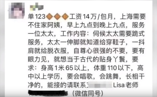 ·14萬月薪招跪式保姆?上海閔行市監(jiān)局:家政公司涉虛假宣傳已立案。