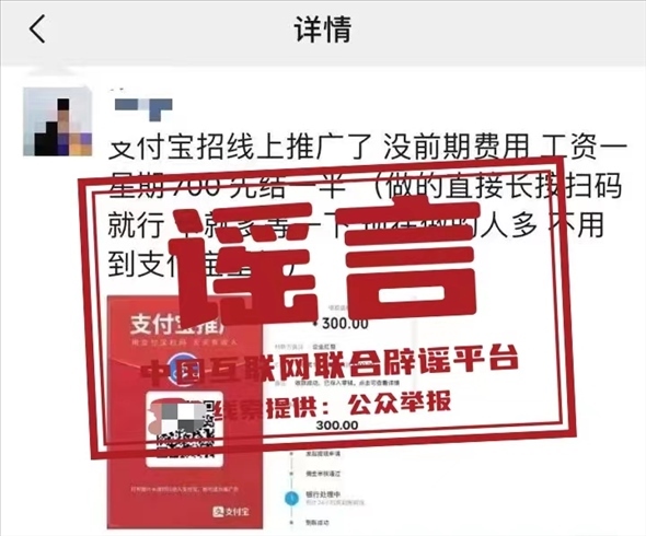 真相:近日,有網(wǎng)民向支付寶開放平臺(tái)反饋,看到有打著“螞蟻推廣”或“支付寶推廣”等旗號(hào),聲稱“出租朋友圈可以賺取100/天”的推廣任務(wù)。對(duì)此,支付寶辟謠稱,此類活動(dòng)均為詐騙,請(qǐng)勿輕信。