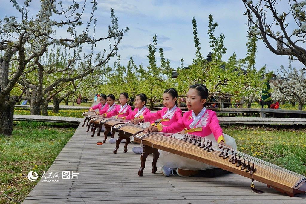 5月11日,吉林省延邊州龍井市萬畝梨園迎來梨花盛開期。走在梨樹下,游客們載歌載舞,彈琴賞花,拍照留念。人民網(wǎng) 李洋攝