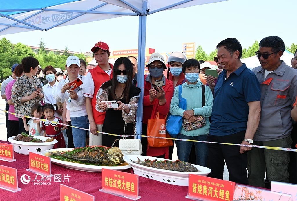 5月17日,“中國旅游日”主題周活動期間,河南省義馬市舉辦“櫻紅五月”美食節(jié),集中展示當(dāng)?shù)氐奶厣朗?、名?yōu)特產(chǎn),為了讓游客有更好的體驗,當(dāng)?shù)?2家飯店還進行了精彩紛呈的廚藝大比拼。活動現(xiàn)場,游客在圍觀經(jīng)典豫菜“紅燒黃河大鯉魚”。人民網(wǎng)記者 王玉興攝