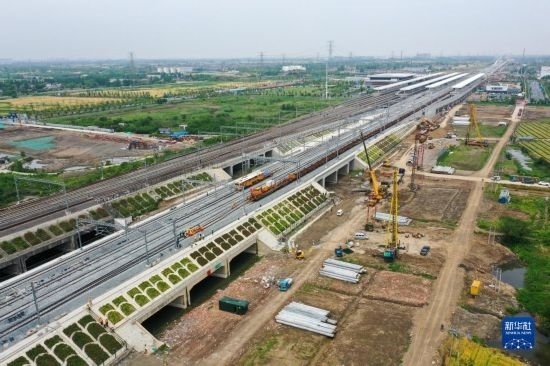 這是5月20日拍攝的滬寧沿江高鐵太倉站施工現(xiàn)場(無人機照片)。
