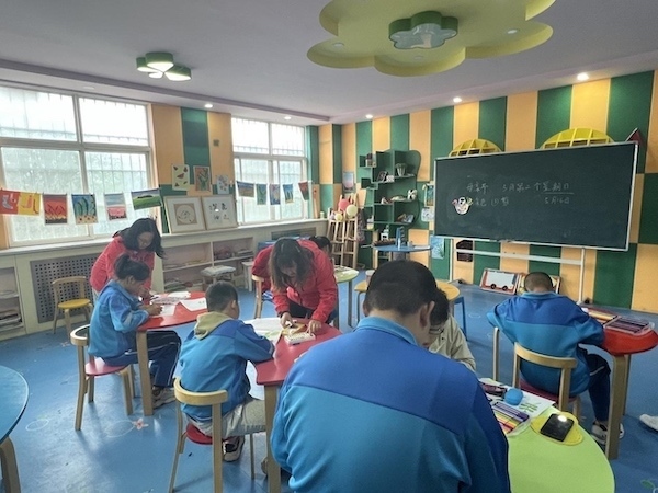 劉若晨(靠窗左一)和其他老師在指導(dǎo)學(xué)生做手工。人民網(wǎng) 高清揚(yáng)攝