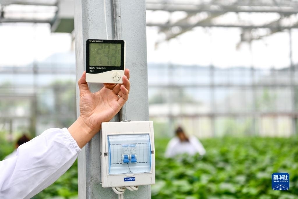 5月23日,工作人員在貴陽市開陽縣南江蔬菜良種繁育中心查看育苗大棚內(nèi)溫濕度。